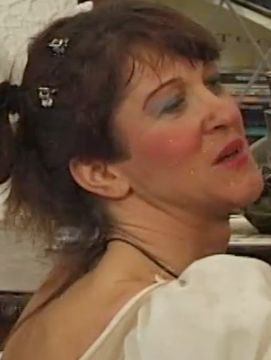 - German, unicorn tattoo upper arm, below neck; pierced nose and clit, missing a finger on right hand